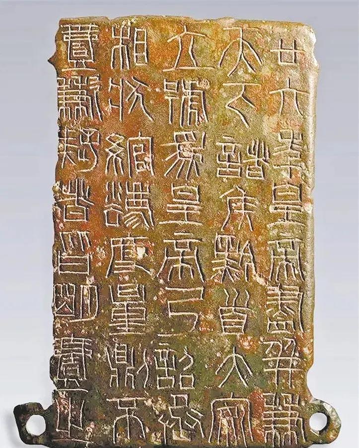 诏版文字由丞相李斯主持统一书写,标志着"书同文"政策实施,奠定了小篆标准化体系。其书法风格近于泰山刻石等金石碑刻,但因青铜材质镌刻特性,笔画较石刻更为方硬率意,形成独特艺术价值。镇原县出土诏版经1996年国家文物局专家组鉴定为国家一级文物,为研究秦代北地郡政治经济及度量衡制度提供了关键物证。